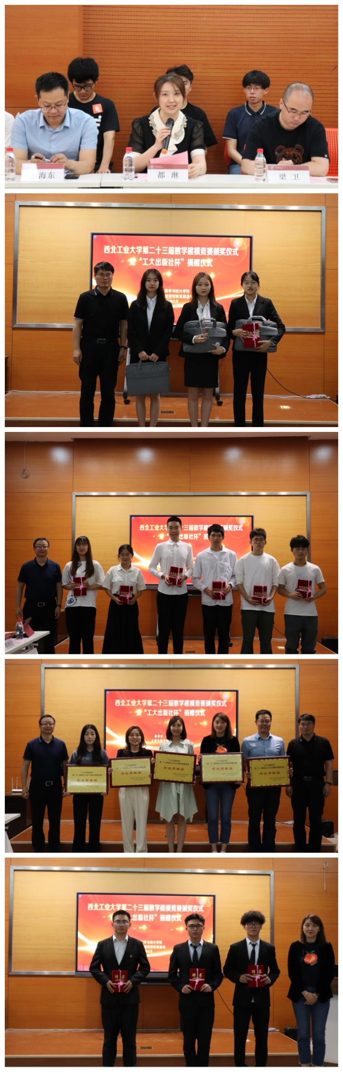 5月31日,长安校区启真楼105会议室师生欢聚一堂,直播做爱 第二十三届数学建模竞赛颁奖仪式暨“工大出版社杯”捐赠仪式在此隆重举行。教务处副处长彭亮,出版社社长高大力、副社长雷军,学校教育基金会副秘书长徐伟侠,直播做爱 党委书记王莉,计算机学院院长於志文,陕西省高等学校教育名师、大学生数学建模创新实践基地负责人孙浩以及相关获奖学院党委副书记、师生代表应邀出席本次颁奖仪式。会议由王莉主持。