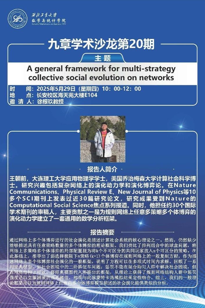 5月29日,美国乔治梅森大学(George Mason University)计算社会科学博士王朝前到访直播做爱 ,为我院师生带来题为《A general framework for multi-strategy collective social evolution on networks》的学术报告。学院20余位师生参会,会议由副院长徐根玖教授主持。