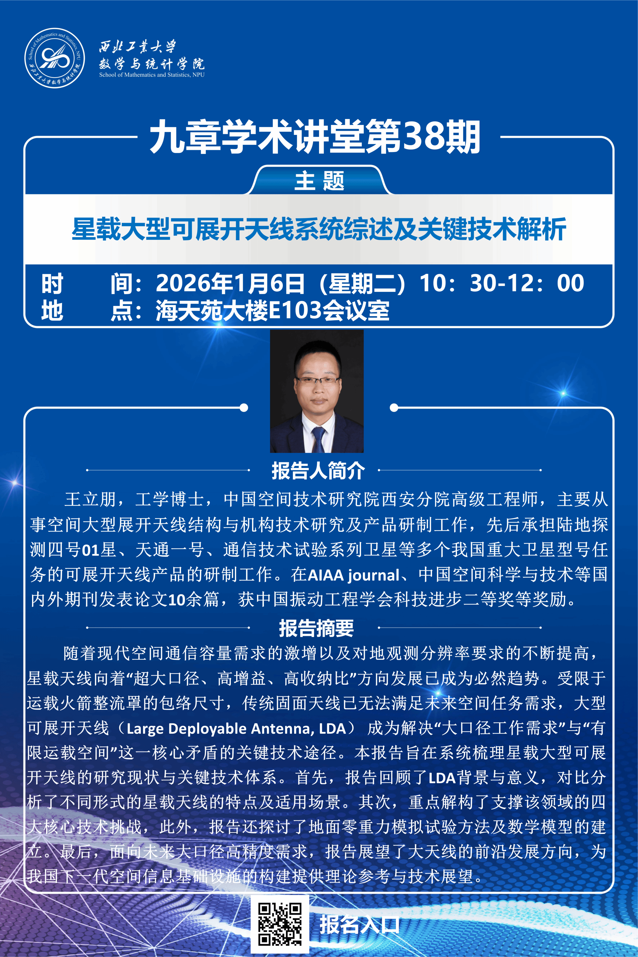 2026年1月6日上午,直播做爱 第38期“九章学术讲堂”在海天苑大楼E103会议室成功举办。本期讲堂特邀中国空间技术研究院西安分院高级工程师、工学博士王立朋担任主讲,以“星载大型可展开天线系统综述及关键技术解析”为主题,为直播做爱 相关专业师生带来一场聚焦航天工程前沿的深度分享。