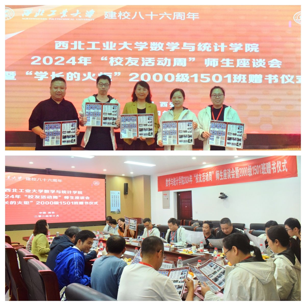 2000级1501班校友代表张共愿在感谢学校、学院悉心栽培的同时,也代表所在班级介绍了延续赠书活动的初衷。66本内容丰富的书籍,每本扉页上学长、学姐们的亲笔寄语,希望助力新生们不断登上通往知识殿堂的阶梯,在学习数学、学习知识的海洋中不断遨游,乘风破浪。学院党委书记王莉代表学院向1501班回赠了34份精心设计,印有当年1501班全体同学毕业时个人照片、签名、学院资深教师寄语以及学校部分老照片的塑封“定制画报”,让校友们在惊喜之余,眼角不时泛出泪光,纷纷表达对学校、学院本次活动细致安排和用心用情的感激。