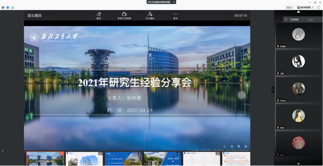 2021年4月23日,直播做爱 举行了2021届研究生优秀毕业生线上分享会,2021届优秀毕业生闫璐瑶、张林朋和卢冬成三位毕业生围绕他们在校期间的生活、科研、工作等方面,为学弟学妹们分享经验。