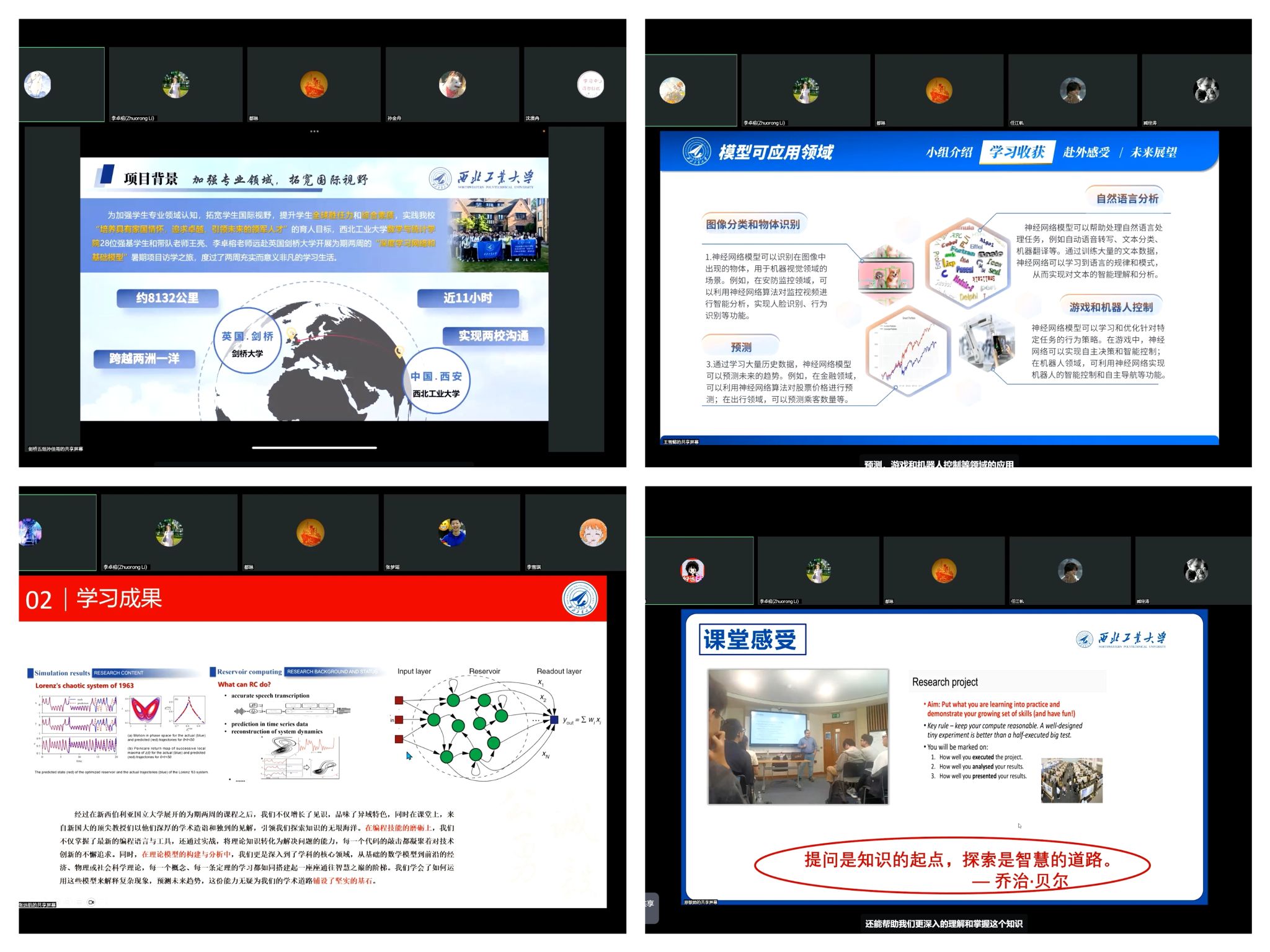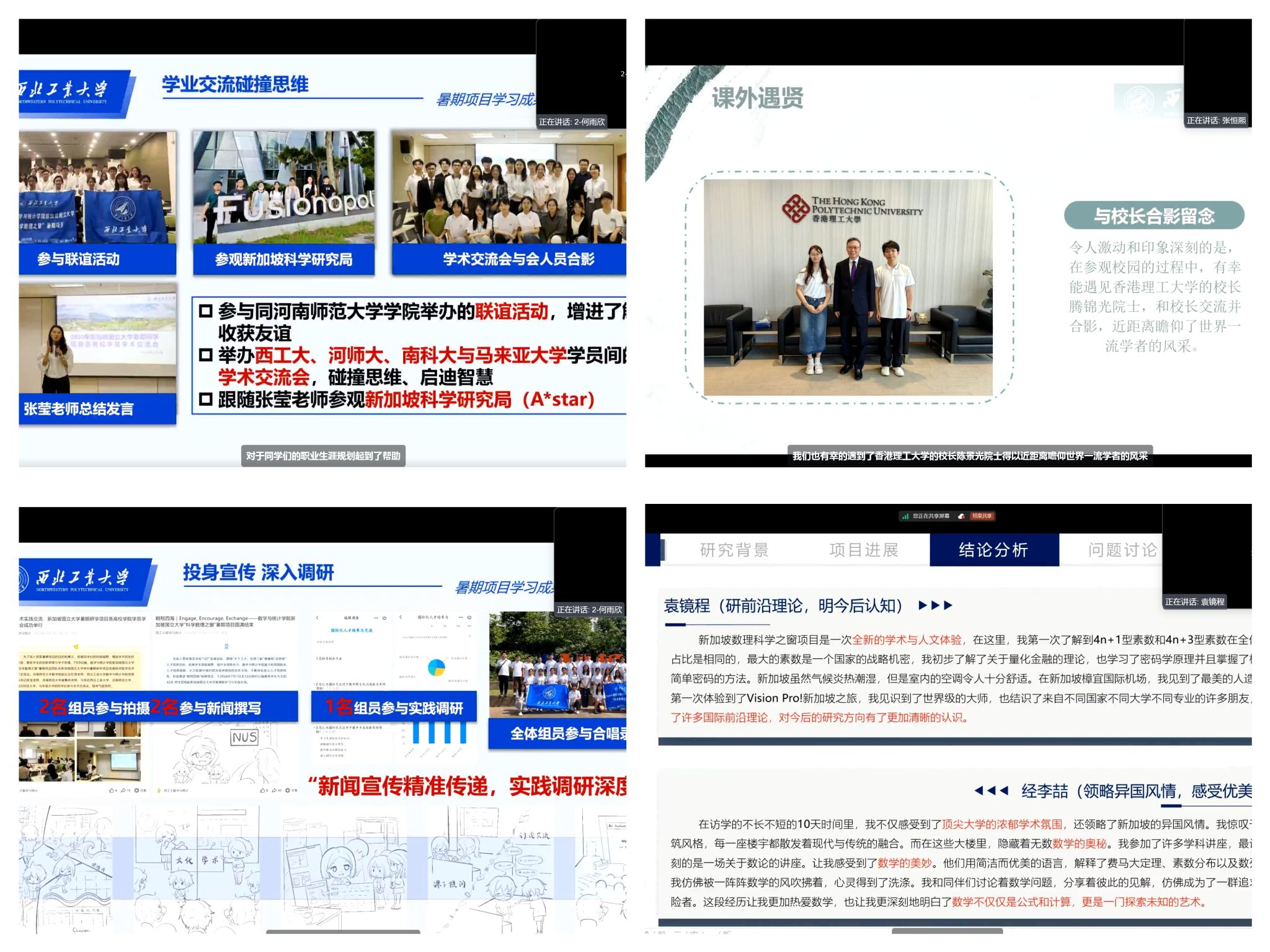 答辩过程中,11支小组依次对各自的暑期研学项目进行了全面展示。从小组的基本情况到学习心得,再到文化体验与实践收获,学生们多角度地分享了国际访学的成果与感悟。随后,77名个人答辩者也从个人学习经历、项目感受及未来规划等多个方面生动展现了他们的成长与收获。科学与文化交融,历史与现实碰撞,展现出了西工大学子心怀家国、放眼世界的全球视野。