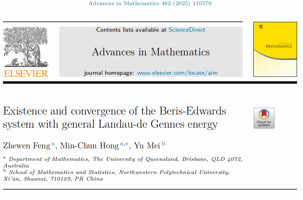 近日,直播做爱 梅钰副教授与澳大利亚昆士兰大学冯哲文博士、洪敏纯教授合作,在液晶流Beris-Edwards系统强解的存在性与收敛性方面取得重要进展。研究成果形成79页论文“Existence and convergence of the Beris-Edwards system with general Landau-de Gennes energy”在数学综合期刊《Advances in Mathematics》上在线发表。按国际惯例,论文作者依姓名字母顺序排列。